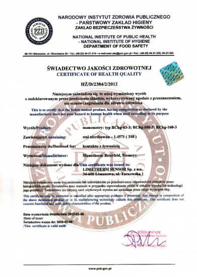 Miło nam poinformować, iż firma Limather Sensor Sp. z o.o. uzyskała pozytywną opinię Polskiego Zakładu Higieny i otrzymała Świadectwo Jakości Zdrowotnej na posiadane w swojej ofercie manometry.