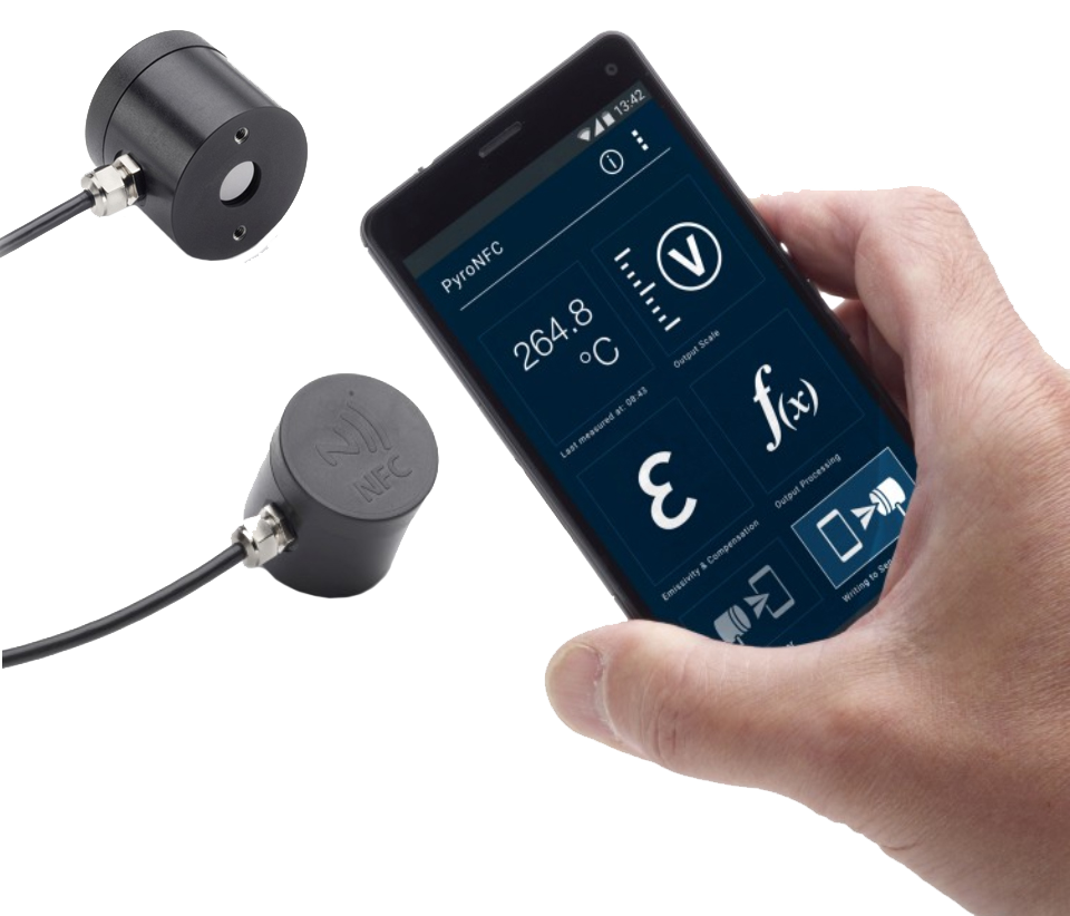 Pirometr stacjonarny o miniaturowych wymiarach, dodatkowe wyjście alarmowe, łatwa i szybka konfiguracja parametrów pirometru za pomocą telefonu komórkowego z NFC i zainstalowaną, darmową aplikacją PyroNFC.