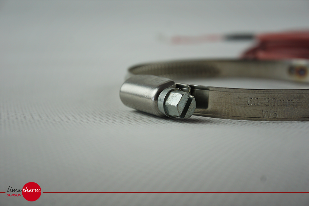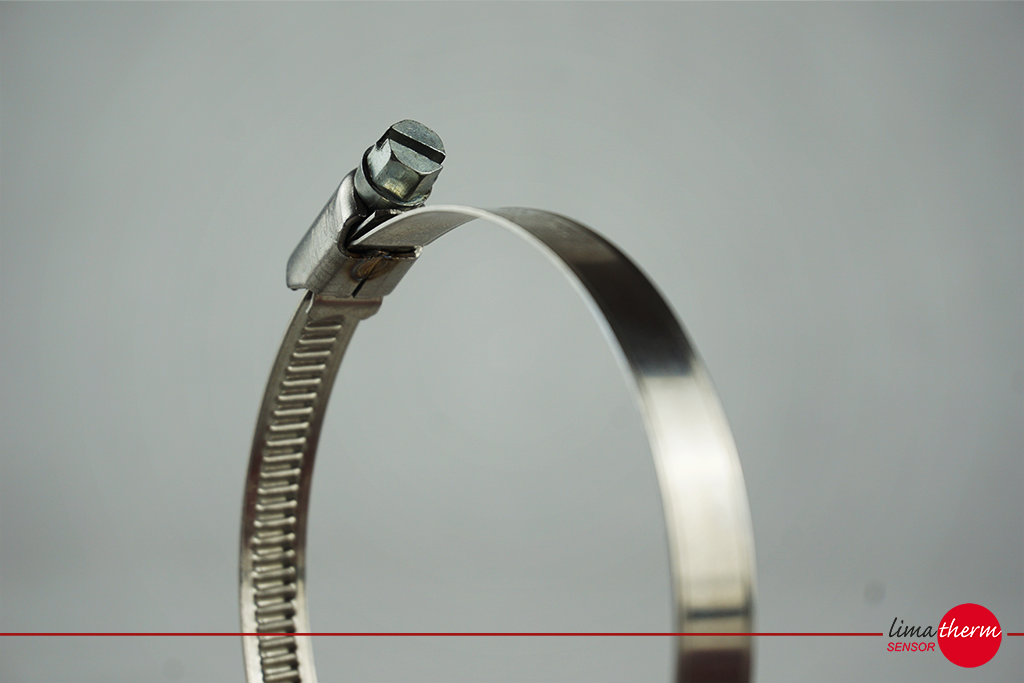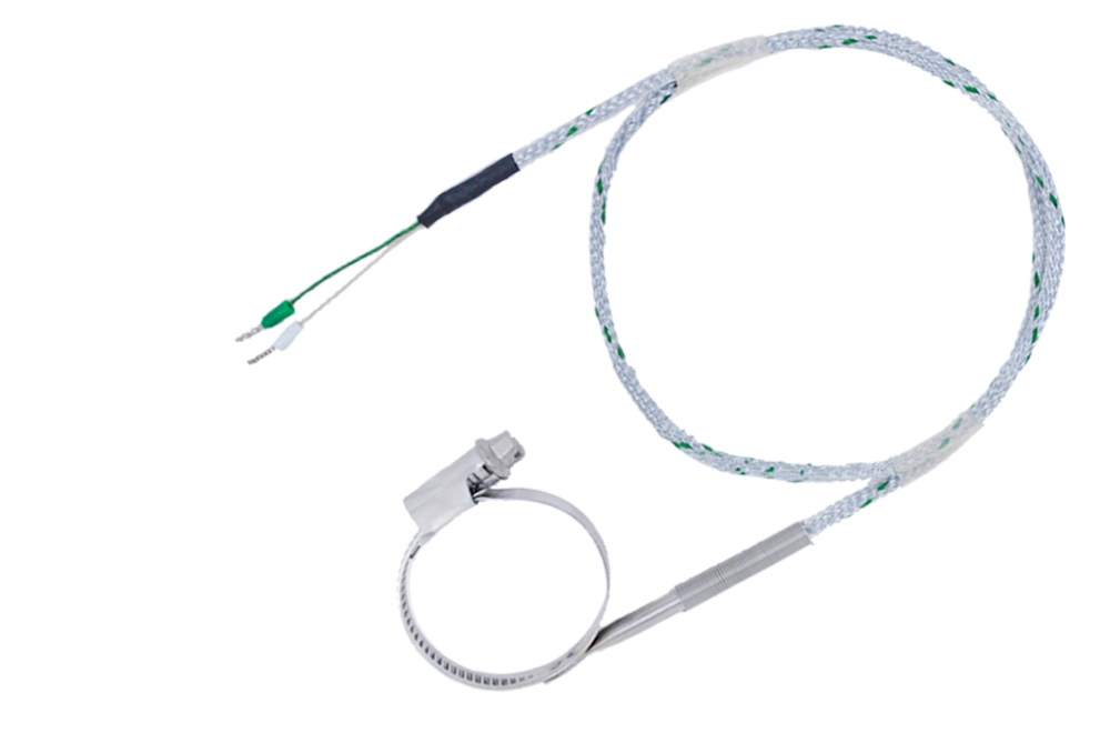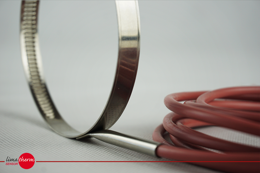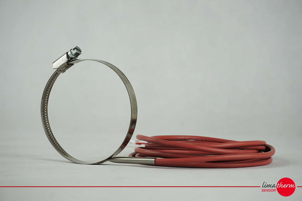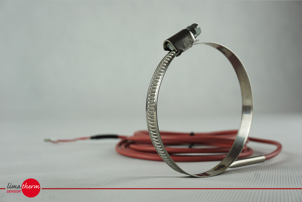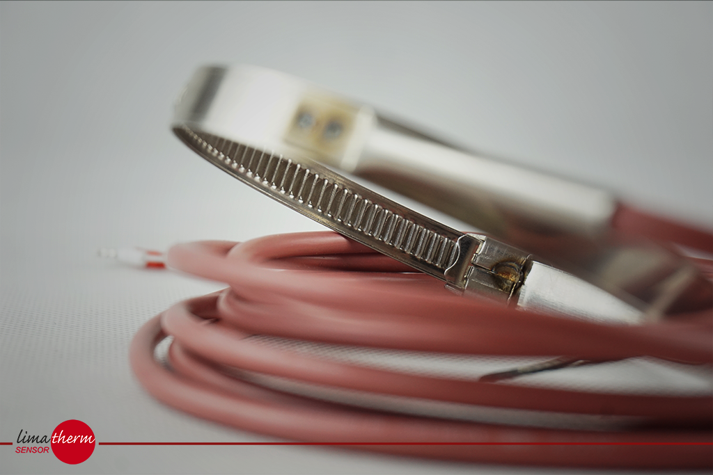 Czujnik z opaską służy do pomiaru temperatury rur i wałków. Opaska zamontowana przy czujniku pozwala na zamontowanie na różnych rodzajach rur i wałków, których temperatura ma być mierzona.